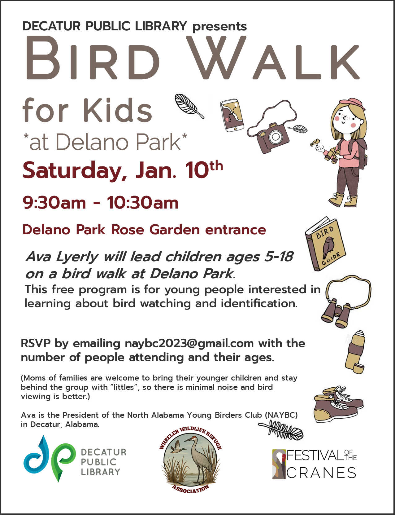 The North Alabama Young Birders Club (NAYBC) is based in Decatur, AL for ages 7-17. They meet every month at the Decatur Public Library and arrange monthly bird walks to different birding hotspots/locations in the area.