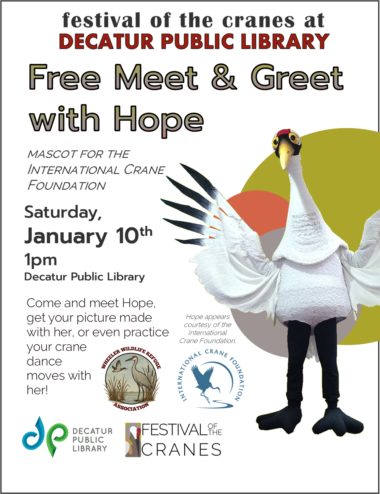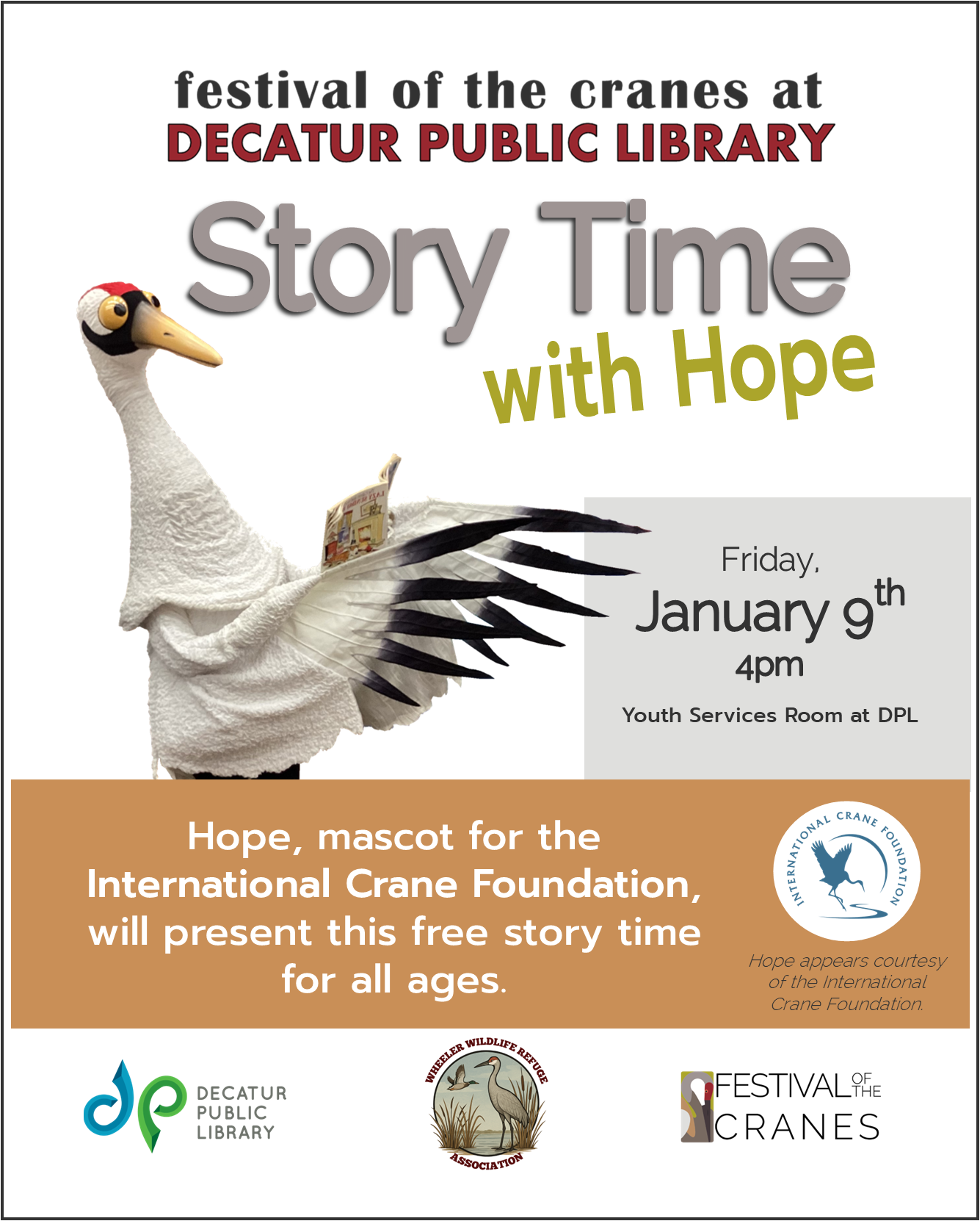 Hope, mascot for the International Crane Foundation, will present this free story time for all ages. Hope appears courtesy of the International Crane Foundation.