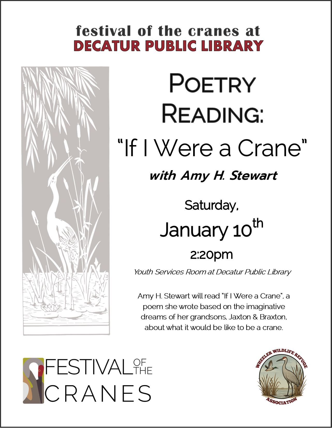 Amy H. Stewart will read “If I Were a Crane”, a poem she wrote based on the imaginative dreams of her grandsons about what it would be like to be a crane.