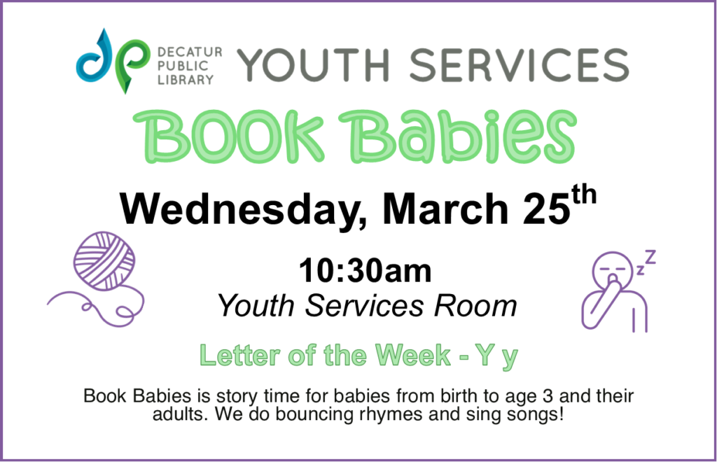 Book Babies is story time for babies from birth to age 3 and their adults. We do bouncing rhymes and sing songs!  Siblings are welcome, too!